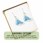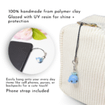 A cute blue whale clay charm. There’s a lot of tiny details on this charm, including spots on his back and forehead! Bits of glitter is mixed into the water splash for a sparkly effect. The water splash also glows in the dark.