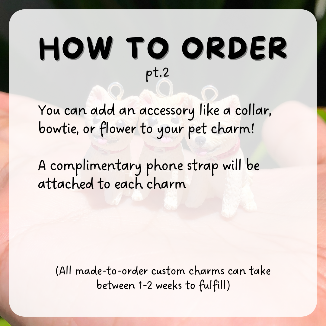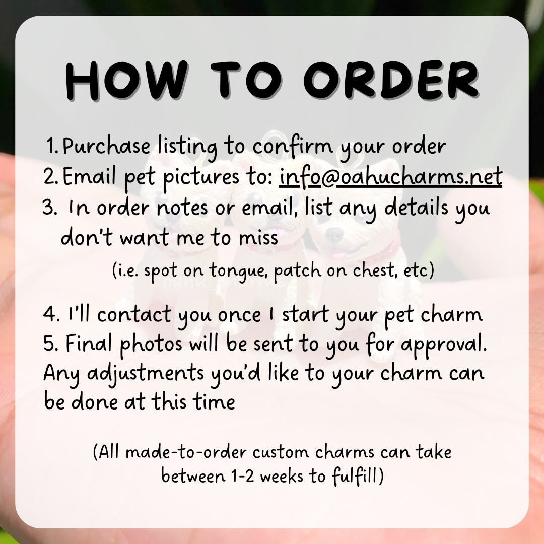 - Custom pet charms are made-to-order and can take up to 2 weeks to fulfill. I will contact you directly once your order is placed to smooth over details!